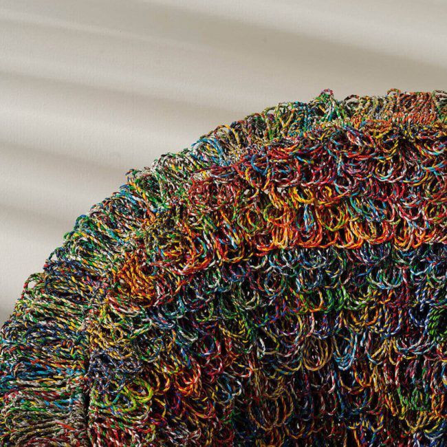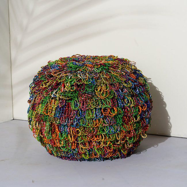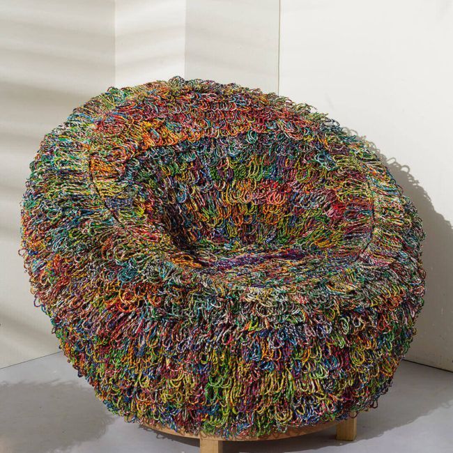 The main chair is 80cm in diameter while the foot stool is 45cm diameter. The set makes use of metal frames, wooden legs, and a total of 15 kilos of roped plastics from food packaging.