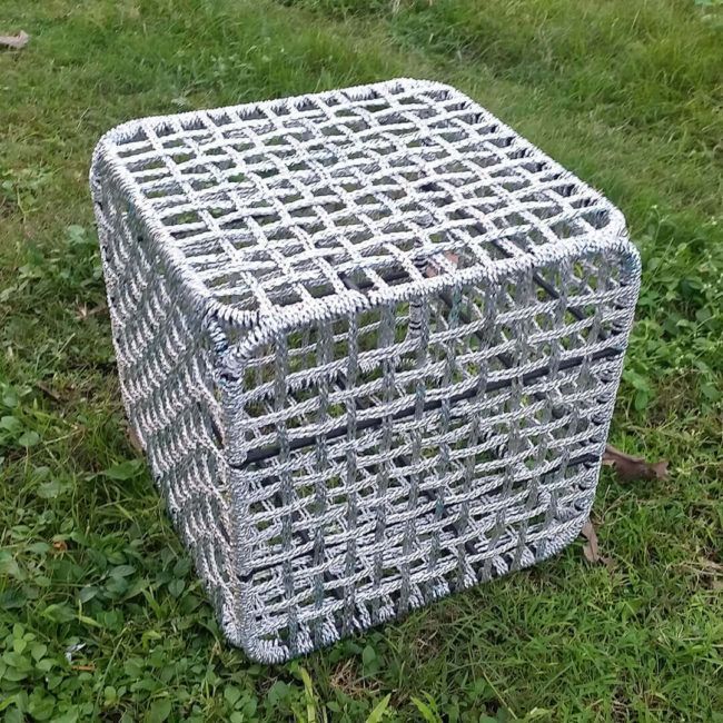Cube stools measure 45 x 45 x 45cm and is made from metal frame cube with 1.6 kilos of interlocked plastic ropes.