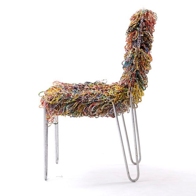 Ikaw at Ako (You and Me) are twin chairs with contrasting colors. Both metal-framed chairs are each draped with 4 kilos of interwoven roped plastic from plastic wrappers. The colorful one of the pair is made from the exterior side of roped plastics, while the silver one of the pair is made from the reverse side of the roped plastics. The chairs measure 45 x 45 x 90cm and uses 4 kilos of roped plastic wastes.