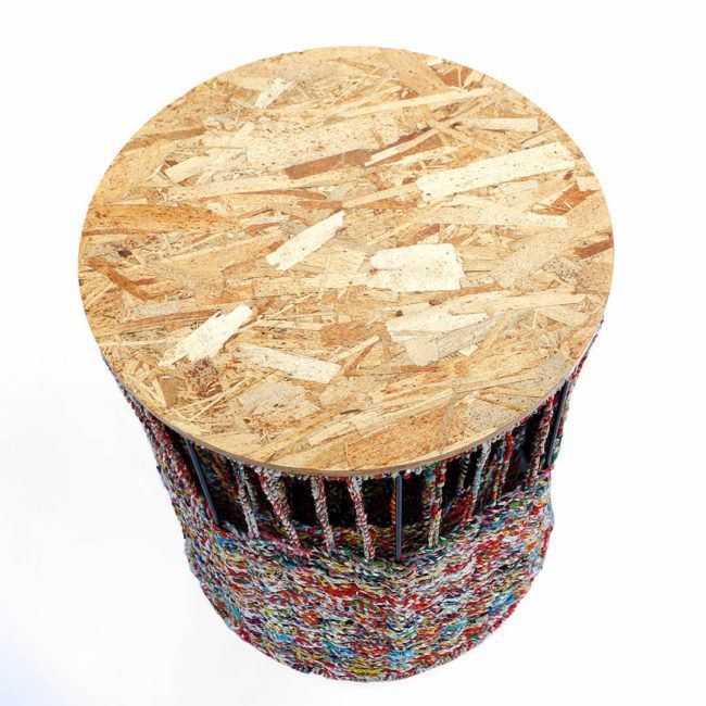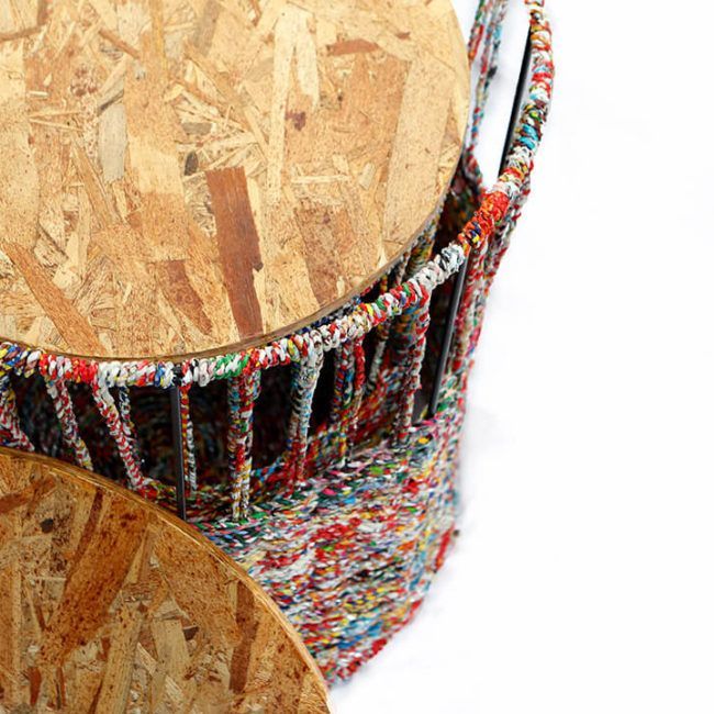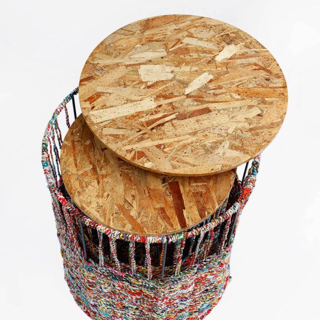 The storage table is an easy, and visually-arresting storage container. The base is made from steel wires with woven roped plastics. Its round tabletop is made from composite wood shavings. There are two sizes, which are 40cm. by 60cm. and 35cm. by 55cm. The tables use an average of 3 kilos of plastic waste ropes.