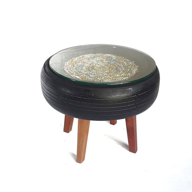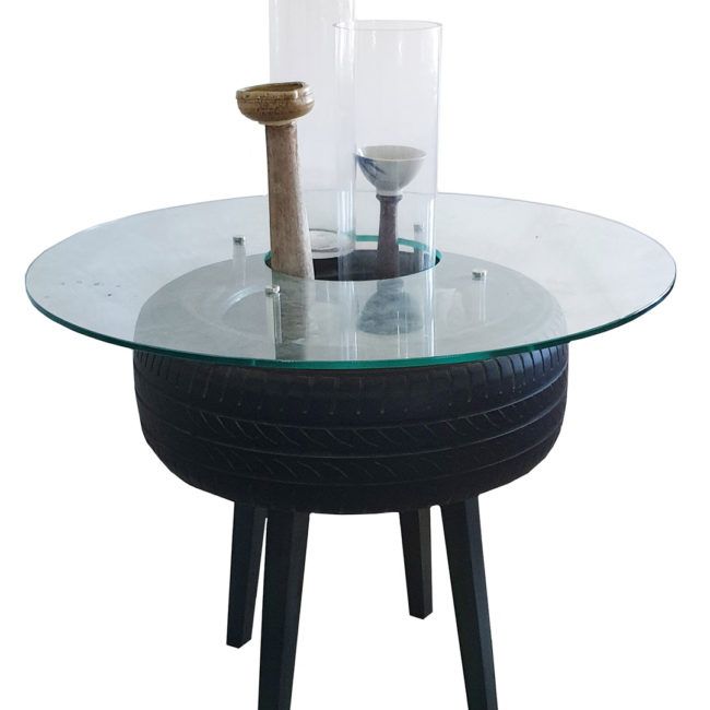 Tire’d Tables make use of old tires to make durable tabletops and upcycled balusters for sturdy legs. The tires are then topped by round tempered glasses supported by stainless steel bars. The round space at the center of the tire tabletop are custom-filled with different items. The Tire’d tables measure 90cm. in diameter and 71 cm. in height.