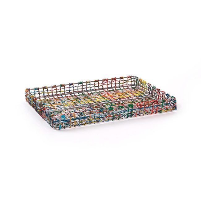 Junknot’s multi-colored organizers are made from 2mm. stainless steel metal frame woven with roped plastic. The deep organizer box contains .2 kilo of plastic waste ropes. The round tray contains .4 kilos of plastic waste ropes. The rectangular tray contains .1 kilo of plastic waste ropes.