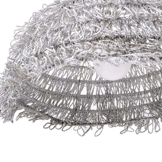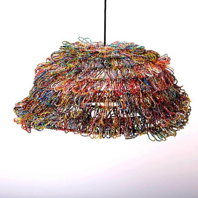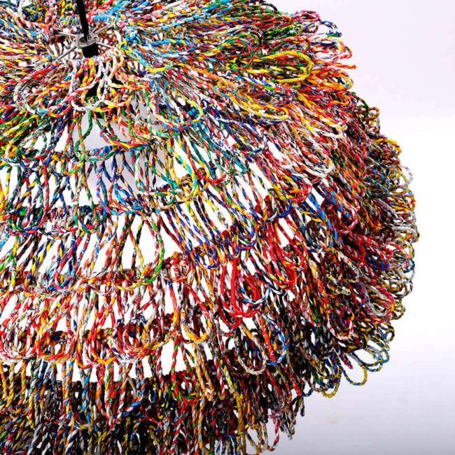 Saklob takes inspiration from the shape of clay pot lids. Several levels of stainless rod frames with a final diameter of 60 cm. and a height of 30 cm. are knotted with 2.85 kgs of the distinctive Junknot plastic twine. The knotting technique used on the Saklob softens the LED light, making it ideal for mood lighting.