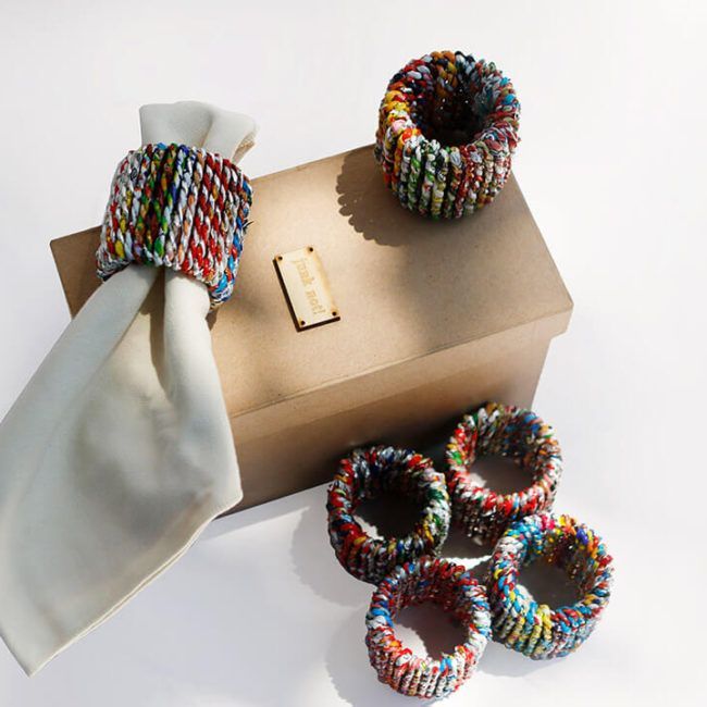 The Junknot table napkin rings come as a boxed set. Each ring is embellished with .30 kilo of thin multi-colored plastic ropes.