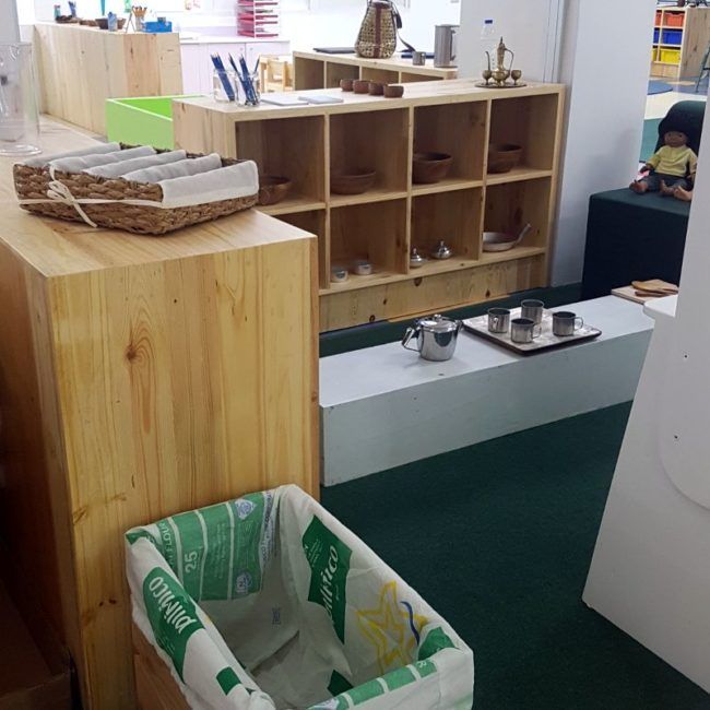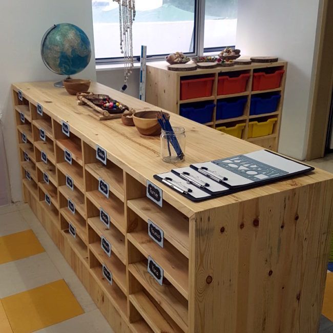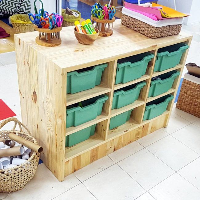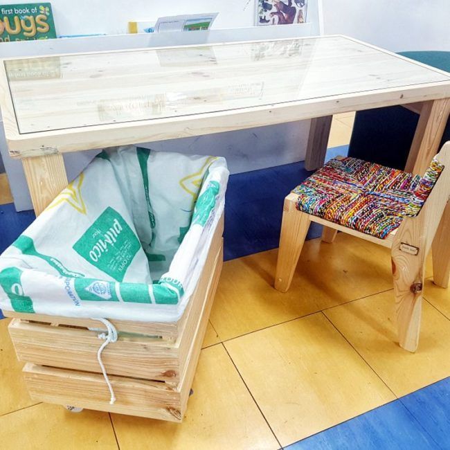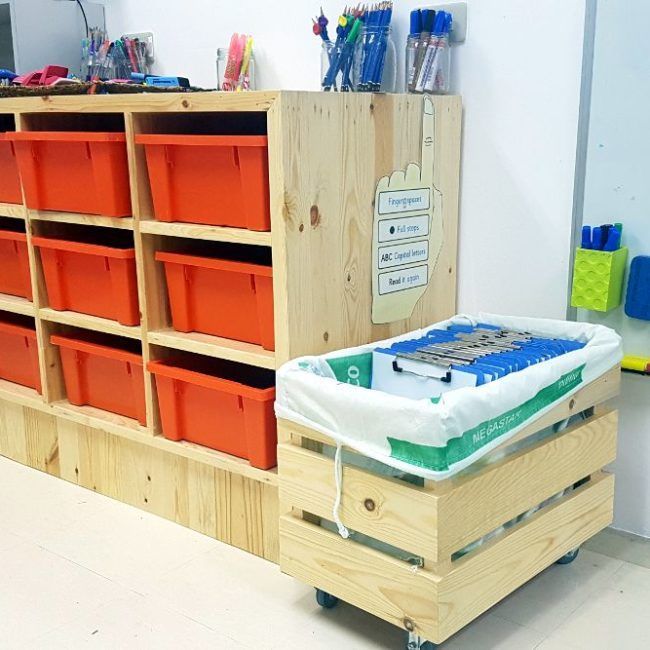 A play school becomes an ideal learning space for children with both the calming and stimulating effects of wooden surfaces. Shelves with color-coded pull-out boxes makes it easier to organize learning tools and toys for each student. Wheeled boxes with upcycled flour cloth linings make moving things around easier. All of the wooden furniture are made from 200 reclaimed pallet boxes.